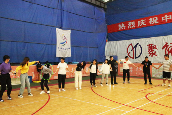 每組人員手拉手,不能松開,讓呼啦圈依次穿過每個人的身體,一組一組進行,計時游戲。