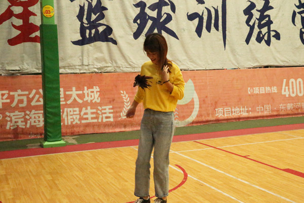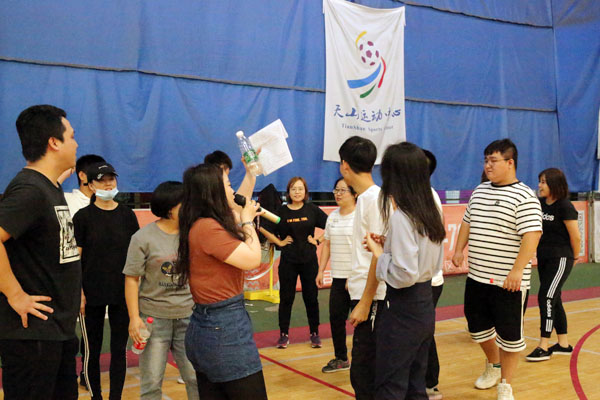下井字棋,每個隊各有自己的標志物(兩個不同品牌的礦泉水),兩兩對決。每隊每個人輪流上場,直到有一隊率先連成一條線,前一人回來后,與下一個人擊掌接力,下個人才能上,沒有擊掌的,不作數(shù)。每輪的獲勝隊加一分。可以選擇放置新的瓶子,也可以挪動已經(jīng)放好的,但是只可以動自己隊的,不可以動對方的。
